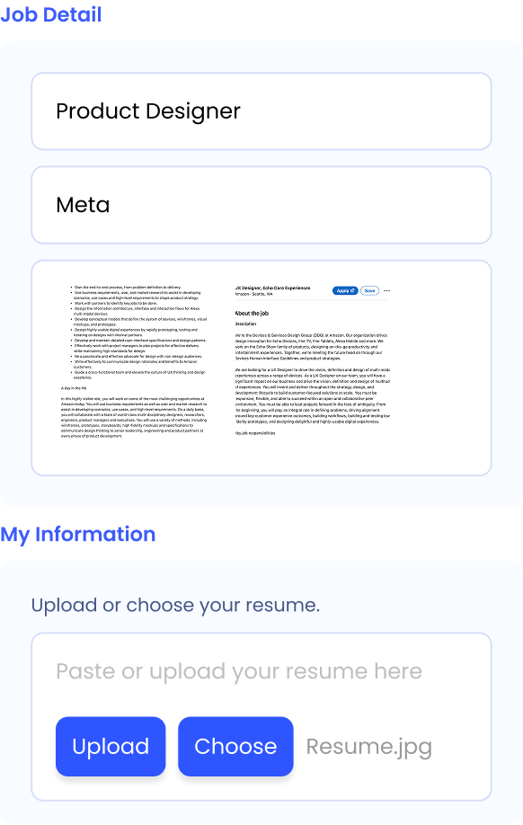 Start by uploading your job description and résumé, so we can learn about you and this job opportunity.