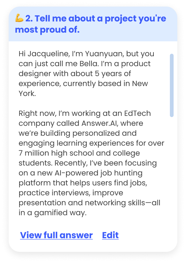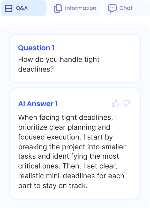 Our AI pairs your résumé with the job role to predict potential interview questions and draft personalized answers in your tone.